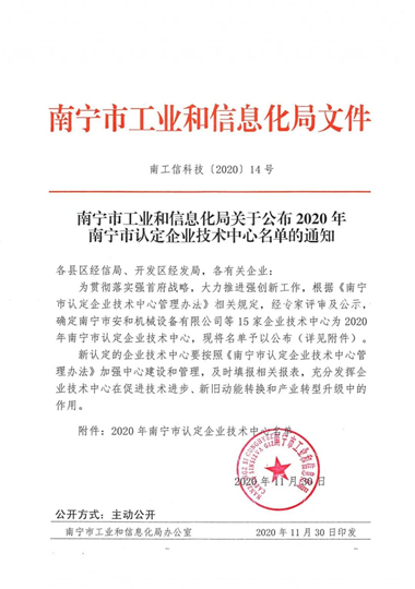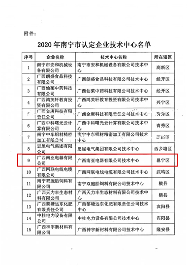 近日,广西南宁市工业和信息化局公示了2020年南宁市认定企业技术中心名单。经南宁市工业和信息化局组织相关部门及行业专家进行审核、查定和评审等工作后,拟定广西南亚电器有限公司技术中心为2020年南宁市认定企业技术中心。