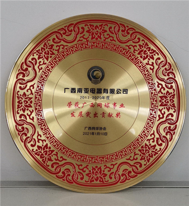 为表彰广西南亚电器有限公司长期为推动广西业余网球事业的发展所作出的贡献,广西网球协会特给广西南亚电器公司颁发了“突出贡献”奖杯。这既是对南亚电器公司长期推动广西网球事业发展所做出的善举的一个肯定,也是对南亚电器公司的一个赞扬。