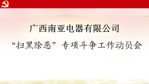 为深入贯彻落实党中央布置的的扫黑除恶专项斗争工作,保障人民安居乐业、社会安定有序、实现国家长治久安。 2019年3月31日,广西南亚电器有限公司召集全体职工开展了“扫黑除恶”专项斗争工作动员会,让员工们充分的认识与体会到党中央的决策,及坚决与黑恶势力作斗争的决心。